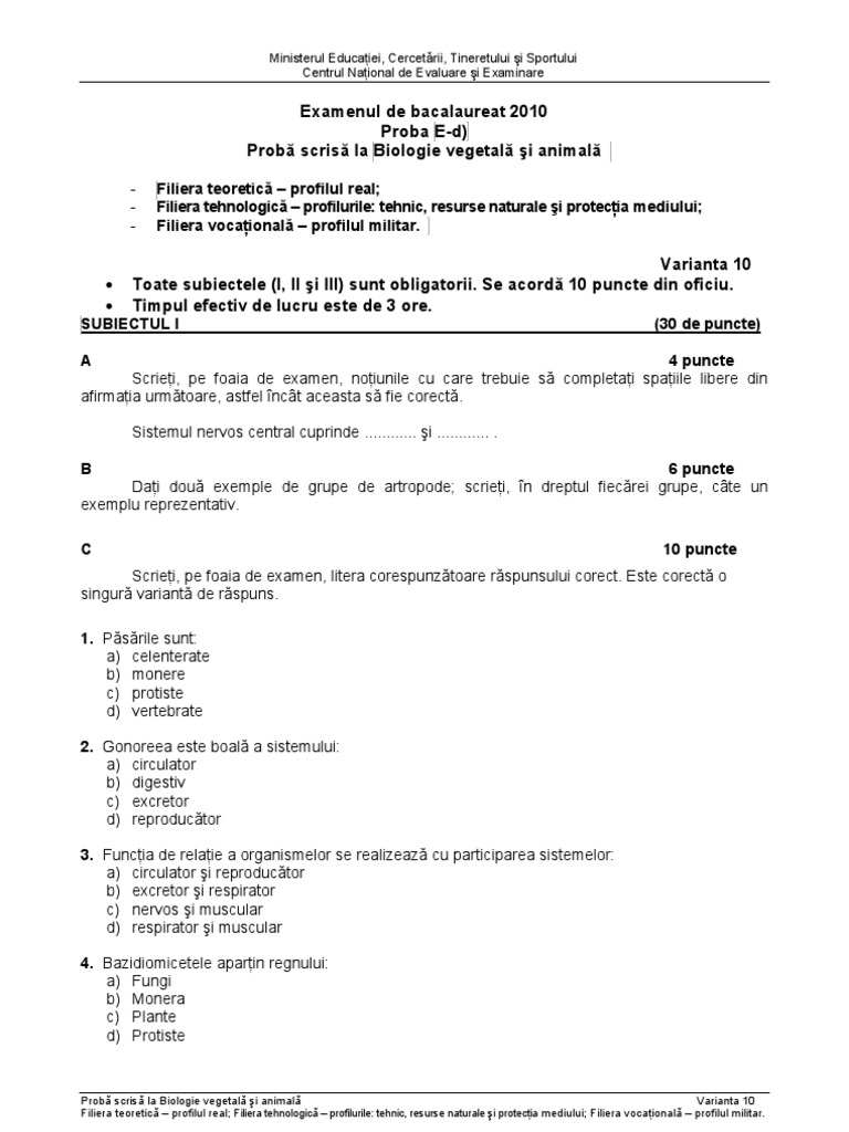 Baremul de verificare răspunsul aşteptat. 100%(5)100% found this document useful (5 votes). Bacalaureat rezolvate subiecte examen bacalaureatul bac variante rezolvare oral scris limba subiectul orala scrisa proba rezolvari referat eseu matematica comentariu bilete 2009 fizica info informatica tic germana franceza. Dacă doriți să ne ajutați cu completarea subiectelor, vă rugăm să ne scrieți. La subiectul al doilea au avut de rezolvat cerințe privind vasele de sânge la mamifere, iar la subiectul al treilea despre organele de simț.
